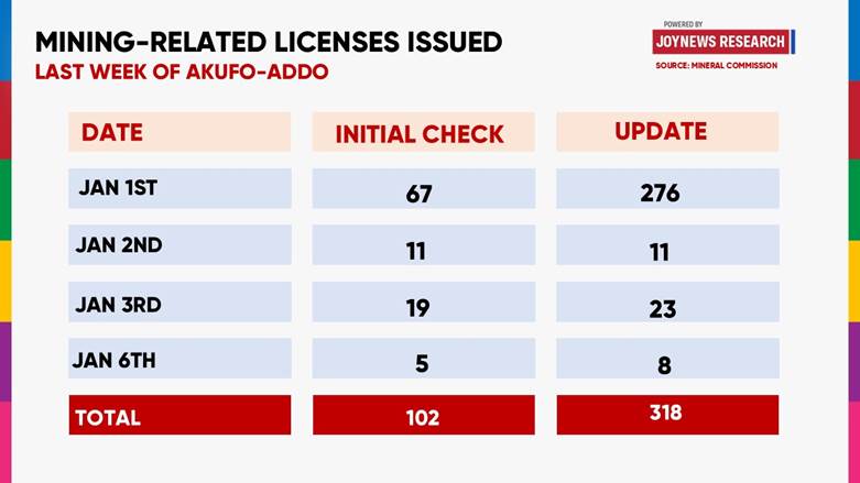 The Minerals Commission has updated its records, revealing that 318 mining-related licenses were to commence in the final week of former President Akufo-Addo’s administration—more than tripling the 102 initially reported.