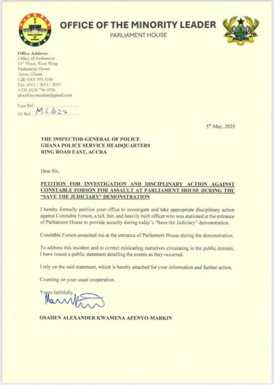 The Minority Leader in Ghana’s Parliament, Alexander Afenyo-Markin, has formally petitioned the Inspector-General of Police (IGP) to launch an investigation into an alleged assault by a police officer during the “Save the Judiciary” demonstration.