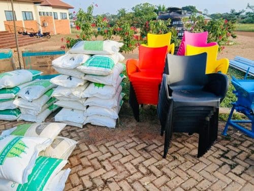 Beneficiaries received tricycles for mobility, deep freezers for business ventures, corn mills for entrepreneurship, plastic chairs for gatherings, automated bicycles for transportation, and polytanks for water storage. Other items included bags of fertilizer and cement for farming and construction, roofing sheets for shelter improvement, industrial machines for income generation, and cash assistance for medical expenses.