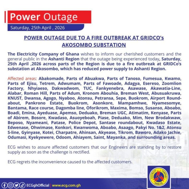 In an official statement released on Saturday, 25th April 2026, the Electricity Company of Ghana (ECG) informed the general public that the fire significantly reduced the total power supply available to the region.