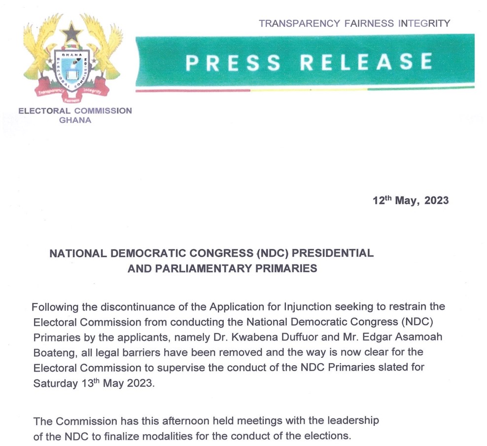 All legal barriers have been removed and the way is now clear for the Electoral Commission to supervise the conduct of the National Democratic Congress primaries slated for Saturday 13th May, 2023, says the elections management body.
