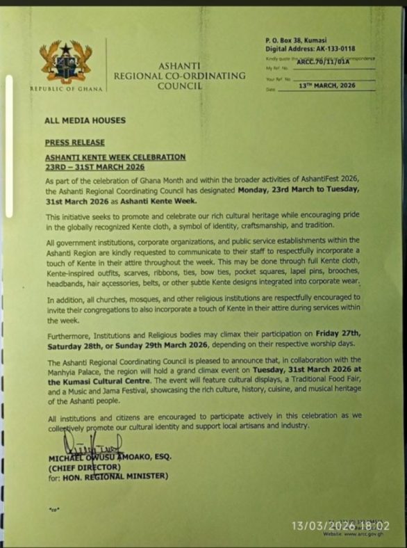 The Ashanti Regional Coordinating Council (ARCC) has announced the inaugural “Ashanti Kente Week”, scheduled to take place from Monday, 23rd March to Tuesday, 31st March 2026.