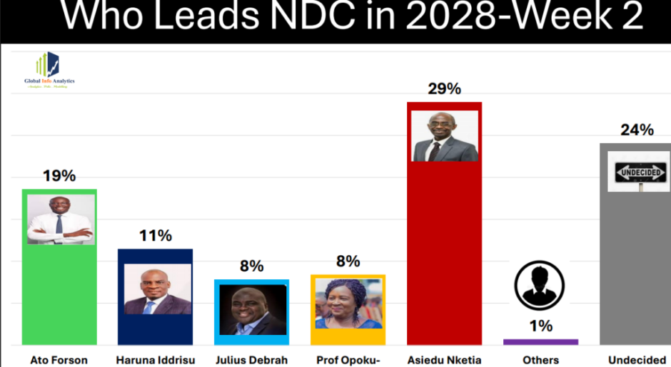 Nketia, who has been criss-crossing the country on a “thank you” tour, leads with 29% support in the second poll round. Ato Forson stands at 19%, followed by Haruna Iddrisu at 11%, Julius Debrah and Prof Jane Naana Opoku-Agyemang tied at 8%, with 1% supporting others and 24% still undecided.