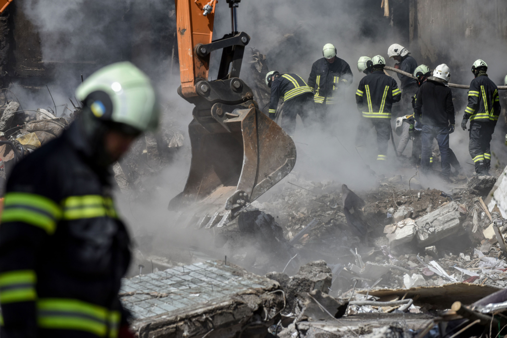 Rescuers work at the site of a damaged residential building in Uman, Ukraine, on Friday. (Oleg Petrasyuk/EPA-EFE/Shutterstock)