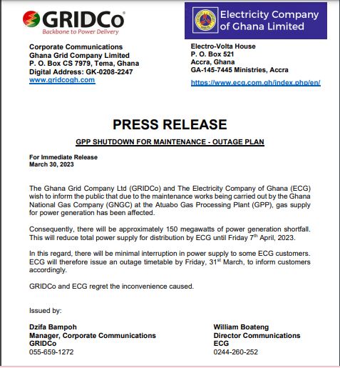 “ECG will therefore issue an outage timetable by Friday, 31st March, to inform customers accordingly,” a joint press statement from GRIDCo and ECG noted.