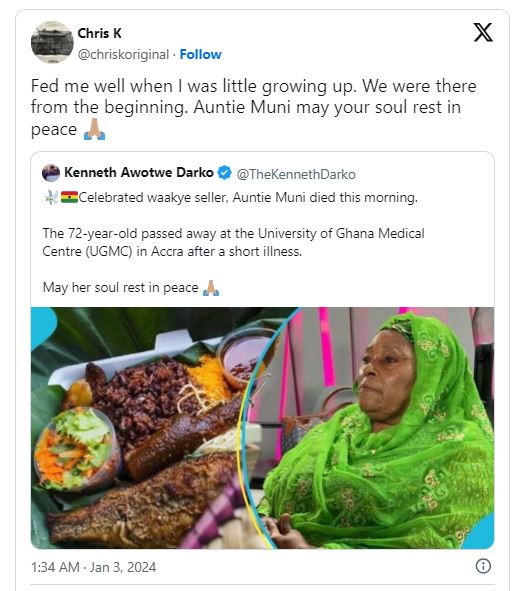 Social media platform X, formerly known as Twitter, is engulfed in sorrow as Ghanaians mourn the passing of renowned waakye seller, Auntie Muni.