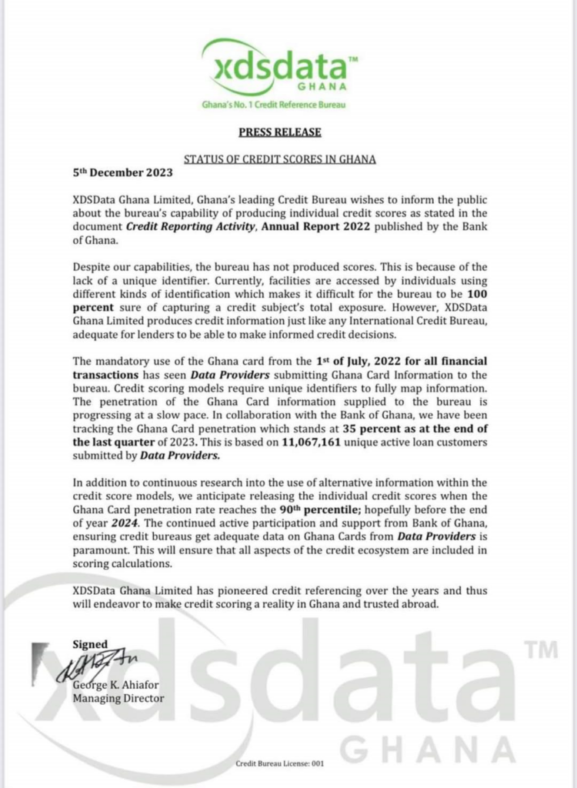 - Until 90%+ of the borrowers in the XDS credit database have Ghana Card information, XDS will not proceed to generate credit scores, though it will continue to issue the individualised credit reports and urge lenders to utilise them in their decision-making.