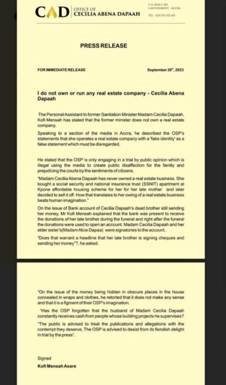The former Sanitation Minister, Cecilia Dapaah has denied claims by the Office of the Special Prosecutor (OSP) that she owns and operates an undeclared real estate business.