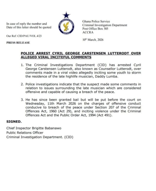 The police said Counsellor Lutterodt has since been granted bail but is expected to appear in court on Wednesday, March 11, 2026.