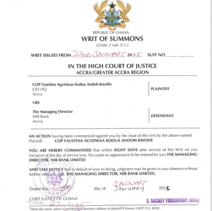 In a lawsuit filed at the High Court in Accra on January 22, 2025, she accuses NIB officials of manipulating account balances belonging to her late husband, COP Stephen Andoh-Kwofie.