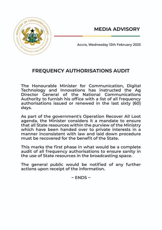 “This marks the first phase in what would be a complete audit of all frequency authorisations to ensure sanity in the use of State resources in the broadcasting space,” it stated.
