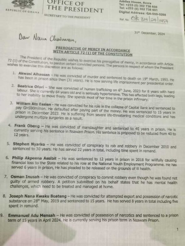 Essien, who was convicted for his role in the financial crimes surrounding the collapse of Capital Bank, had been serving a 15-year prison sentence. His inclusion in the pardon list, revealed through a letter from the Office of the President, has raised eyebrows, particularly given the severity of his crimes.
