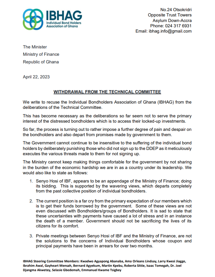 The group further accused the ministry of engaging the convenor of the Individual Bondholders Forum (IBF) Senyo Hosi as a seeming “appendage of the Ministry of Finance; doing its bidding.”