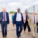 From left to right: Jakob Linulf, Danish Ambassador to Ghana; Moses Kwesi Baiden Jnr., CEO of Margins ID Group; Jørgen Østergård Bollesen, Head of Trade; and Linda Kafui Abbah-Foli, Commercial Advisor at the Danish Embassy, walking on the premises of Intelligent Card Production Systems (ICPS) en route to the factory.