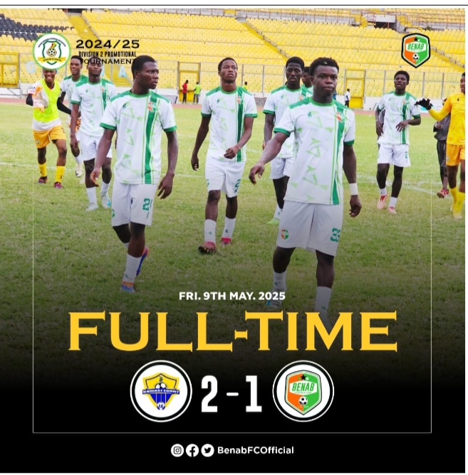 Ebony FC have earned a hard-fought promotion to the 2025/26 Ghana National Division One League (Zone II) after defeating Benab FC 2-1 in a thrilling encounter at the Baba Yara Sports Stadium on Sunday.
