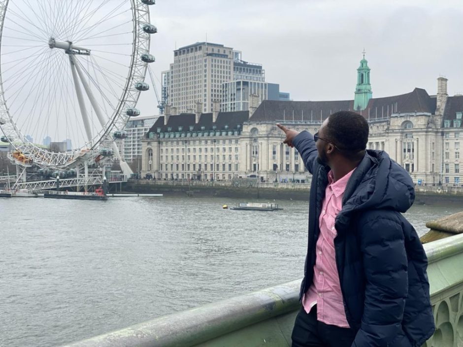 Emmanuel Bright Quaicoe pointing to the London Eye across the Thames River