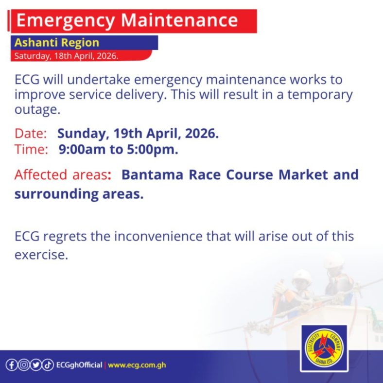 The Electricity Company of Ghana (ECG) has announced that it will undertake emergency maintenance works this coming Sunday, 19th April 2026, to enhance service delivery across the Ashanti Region.
