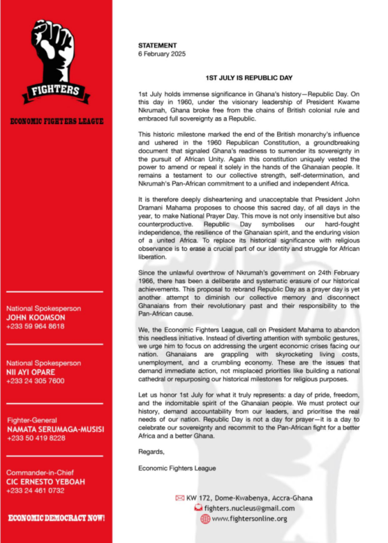 The Economic Fighters League has expressed strong opposition to President Mahama’s proposal to establish 1st July as National Prayer Day, asserting that such a move would diminish the day’s historical significance as a symbol of Ghana’s hard-won independence.