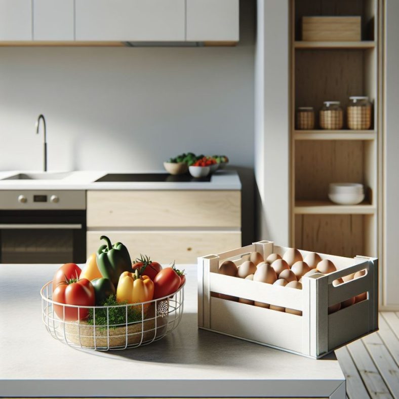 A crate of eggs on a kitchen counter in a minimalist kitchen with a bowl of colourful vegetables nea