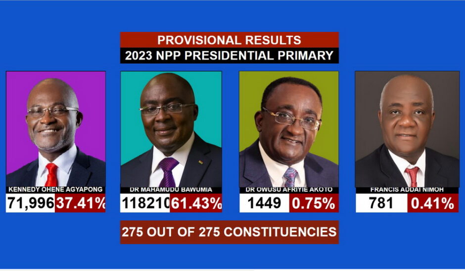 Vice President Mahamudu Bawumia won 15 regions, with second placed Ken Agyapong winning two regions – the Central and Volta regions.