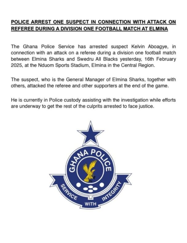 According to the police, Kelvin Aboagye, along with other individuals, physically assaulted the referee and some supporters after the match.