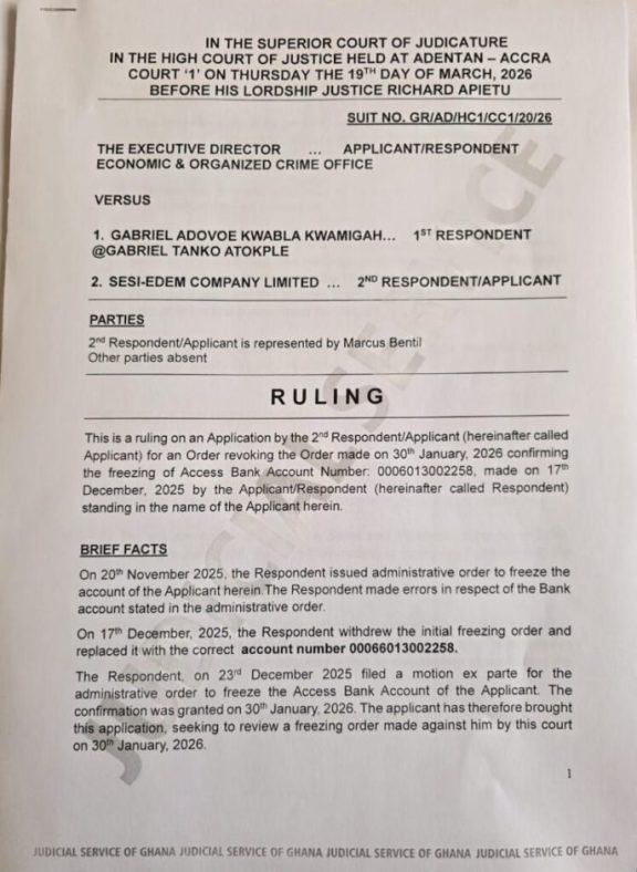 The High Court in Adentan in Accra on Thursday, 19 March 2026, ordered the unfreezing of bank accounts belonging to Sesi-Edem Company Limited, delivering a decisive ruling that vindicates Gabriel Tanko Kwamigah-Atokple, founder of the company, and clarifies the limits of the Economic and Organised Crime Office’s (EOCO) investigative powers.
