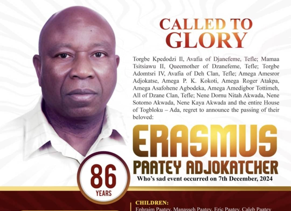Torgbe Kpedodzi II, Avafia of Djanefeme, Tefle; Mamaa Tsitsiawu II, Queenmother of Dzanefeme, Tefle; Torgbe Adomstri IV, Avafia of Deh Clan, Tefle; Amega Amesro Adjokatse, Amega P. K. Kokoti, Amega Roger Atakpa, Amega Asafohene Agbodeka, Amega Amedigbor Tottimeh, All of Dzane Clan, Tefle; Nene Dornu Nitah Akwada, Nene Sotomo Akwada, Nene Kaya Akwada and the entire House of Togbloku- Ada, regret to announce the passing of their beloved: