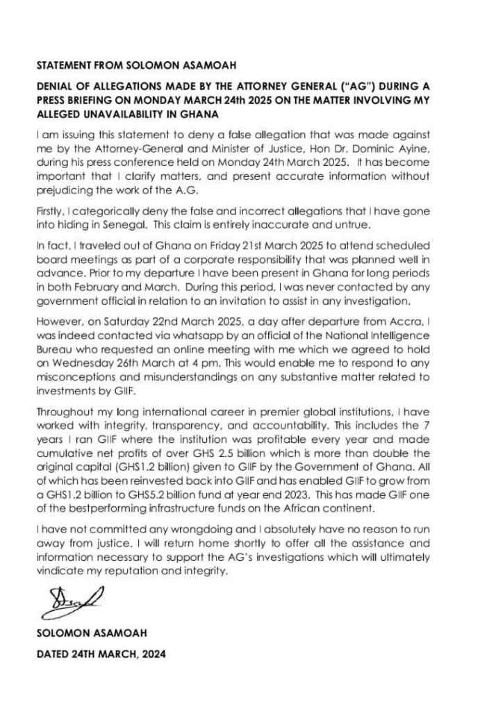 The former CEO of the Ghana Infrastructure Investment Fund (GIIF), Solomon Asamoah, has strongly denied allegations made by the Attorney General and Minister of Justice, Dr Dominic Ayine, that he is hiding in Senegal.