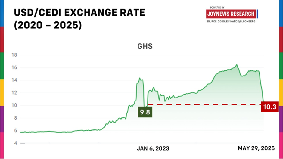 From ending 2024 at $1 to GH₵14.70, the cedi has appreciated nearly 30% in the first five months of this year, currently trading at $1 to GH₵10.30. That’s the strongest level the cedi has reached in over two years, and the sharpest appreciation over this period since 2010.