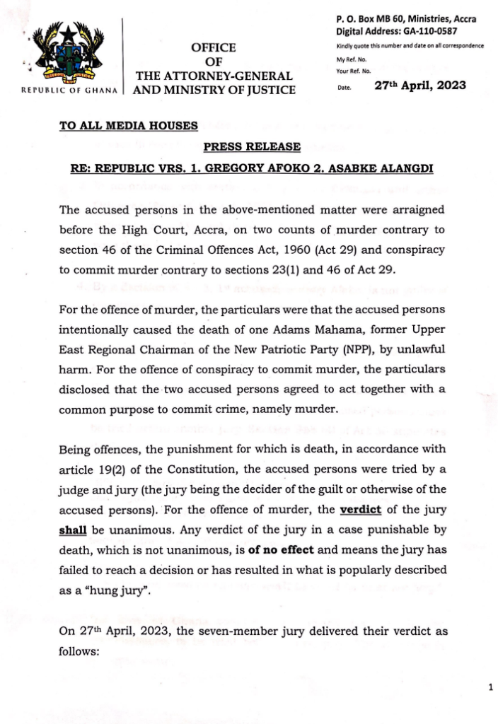 “The instant case, particularly the unanimous verdict of the jury regarding the guilt of the 2nd accused for conspiracy to commit murder, whilst at the same time delivering a hung verdict in the case of the 1st accused on the same charge, highlights the severe challenges with the jury system, a situation the Attorney-General is taking steps to remedy as part of proposals for amendment of many parts of the criminal procedure laws of Ghana,” he wrote in an April 27 press release.