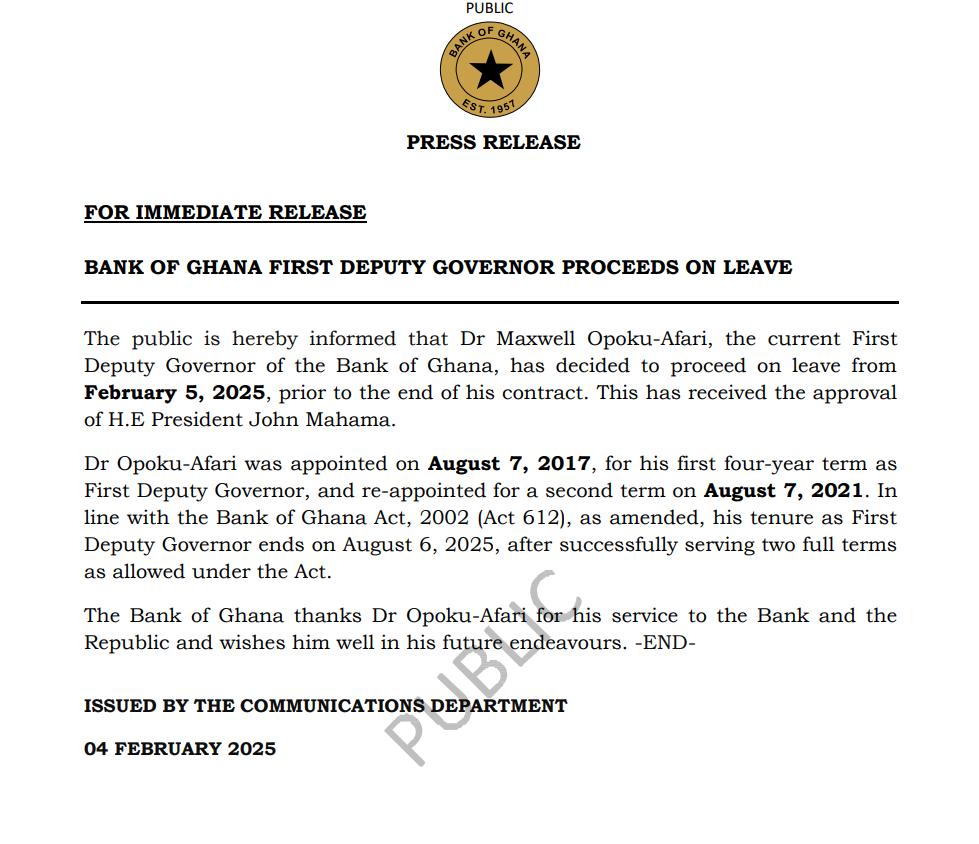 A letter from the Bank of Ghana dated February 4, 2025 said Dr. Opoku-Afari decided to proceed on leave from February 5 prior to the end of his contract and has received approval from President John Mahama.