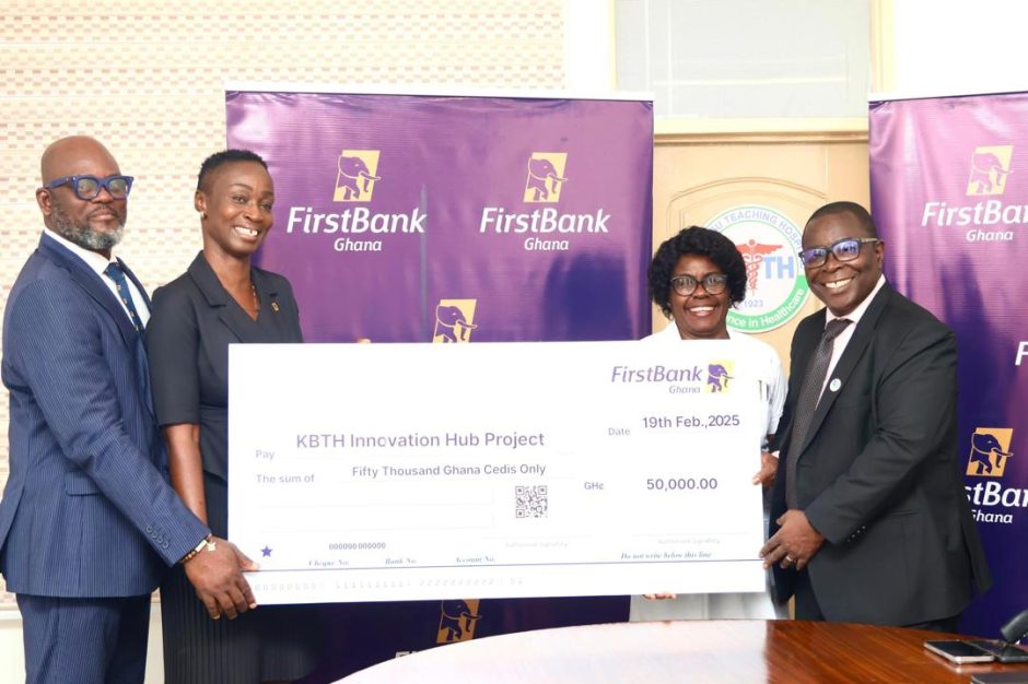 FirstBank Ghana has donated GHS50,000 to the Korle Bu Teaching Hospital (KBTH) Innovation Hub, aimed at supporting research and training initiatives that will enhance medical care in Ghana. The cheque was presented by Mrs. Grace Isaac-Aryee, the Bank’s Treasurer, during a ceremony held at the hospital.