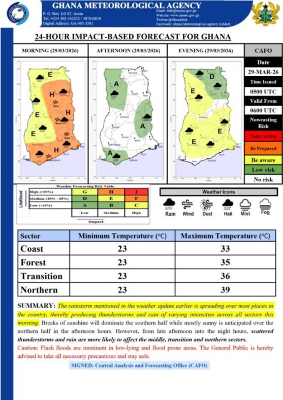 The Ghana Meteorological Agency (GMet) has issued a strong warning of possible flash floods across parts of the country as widespread rains and thunderstorms are expected to intensify on Sunday (March 29) morning.