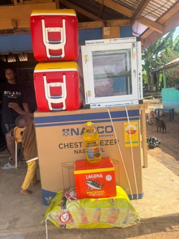 The support package was presented in Akim Oda, Eastern Region, and includes a deep freezer, ice chests, food items, a glass display case for her fried yam and fish business, and cash support to help her establish and sustain her livelihood.