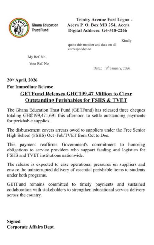 The Ghana Education Trust Fund (GETFund) has released GH¢199.47 million to settle outstanding payments owed to suppliers of perishable goods under the Free Senior High School (FSHS) and Technical and Vocational Education and Training (TVET) programmes.