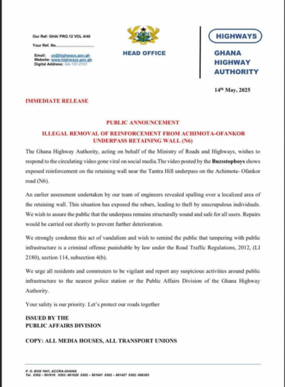 In a public announcement issued on May 14, 2025, the GHA, acting on behalf of the Ministry of Roads and Highways, responded to a viral video posted by the Buzzstopboys that showed exposed steel reinforcements at the site.
