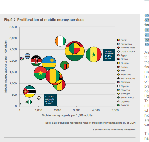 “The uptake of mobile money services – indicative of the need (and desire) to leapfrog traditional financial infrastructure. The value of mobile money transactions in South Africa equates to under 1% of GDP, while the corresponding figures for Senegal and Ghana are well above 100% of GDP”, it added.