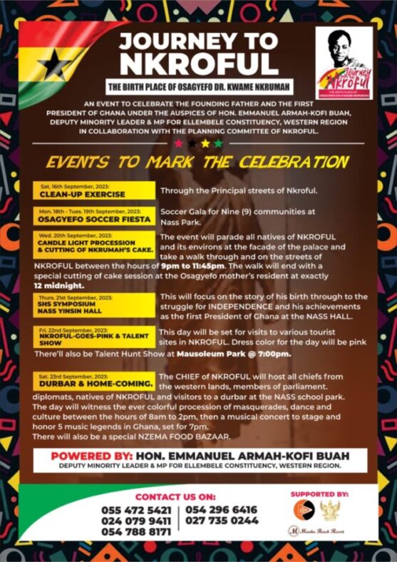 On Wednesday 20th September 2023, there will be a light Procession and Cutting of Nkrumah’s Birthday Cake; the event will parade all natives of Nkroful and its environs at the facade of the palace and take a walk through the principal streets of Nkroful between the hours of 9 pm to 11:45 pm.