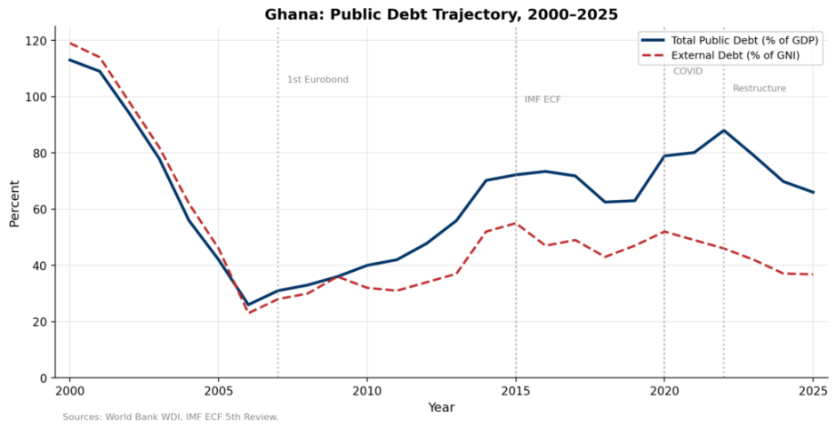 The timing is not accidental. Ghana is emerging from its worst economic crisis in a generation — a sovereign default in 2022, a painful debt restructuring, and a US$3 billion IMF Extended Credit Facility programme that has, by most accounts, put the country back on a path toward stability. Public debt, which peaked at 79.1 per cent of GDP in 2023, is projected to fall below 50 per cent by 2030 under the IMF programme framework.