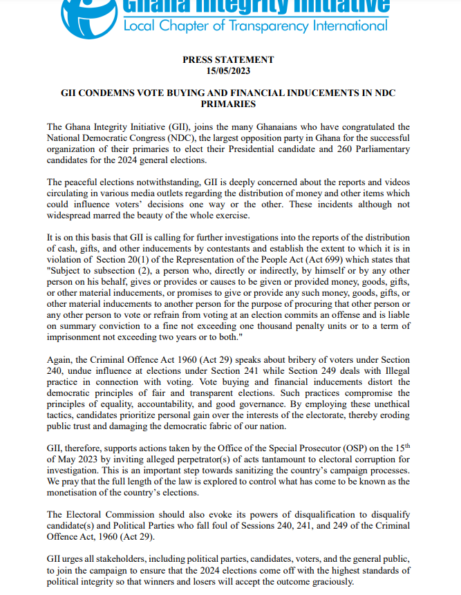 gii condemns vote buying by some parliamentary aspirants at ndc primaries