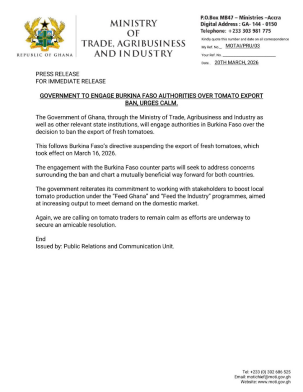 Government has announced plans to engage authorities in neighbouring Burkina Faso following a recent decision to suspend the export of fresh tomatoes, a development that is expected to affect supply and pricing within Ghana’s domestic market.