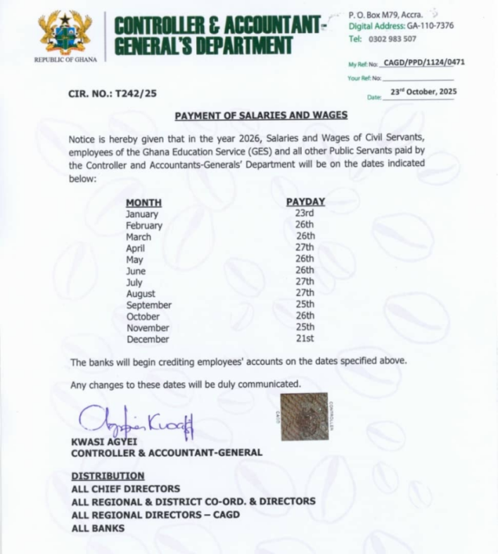The announcement, signed by Kwasi Agyei, Controller and Accountant-General, is expected to assist public sector employees in planning their finances and managing household budgets with greater certainty over the course of the year.