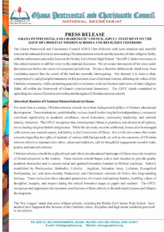 The Ghana Pentecostal and Charismatic Council (GPCC) has issued a statement addressing the ongoing national debate surrounding the role of Christian mission schools and the practice of other religious faiths, with particular focus on Wesley Girls Senior High School.