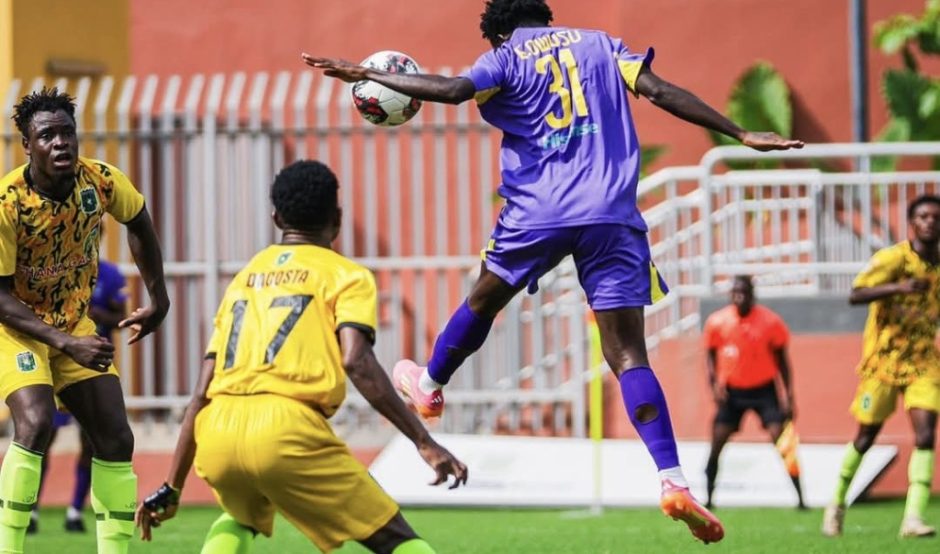 Air marshal! Medeama’s Emmanuel Owusu wins this aerial tussle as Ampem Dacost and his teammates look on in amazement