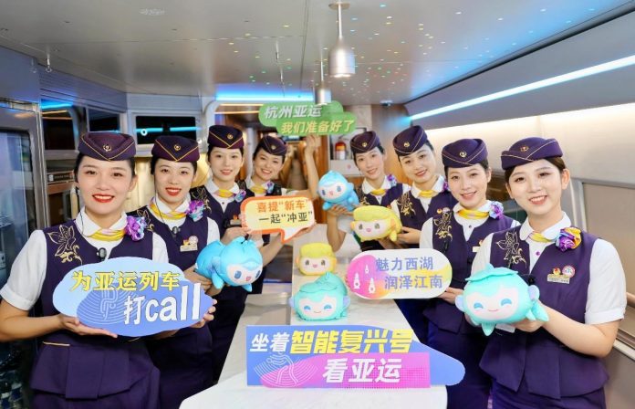 Crew members of a Fuxing bullet train specially designed for the Hangzhou Asian Games pose for a picture on the train in Hangzhou, east China’s Zhejiang province, Aug. 4, 2023. (Photo by Zhou Wei/People’s Daily Online)