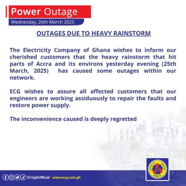 The Electricity Company of Ghana (ECG) has confirmed that a heavy rainstorm that struck parts of Accra and its surrounding areas on the evening of March 25, 2025, has caused power outages in some affected communities.