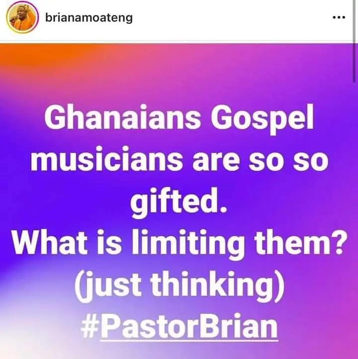 The post read: “Ghanaian gospel musicians are so so gifted. What is limiting them? (just thinking) #PastorBrian.”