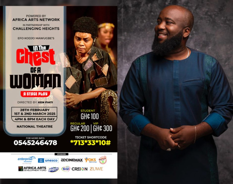 IN THE CHEST OF A WOMAN will run on February 28, March 1, and March 2, 2025, at the National Theatre. Tickets are available online—don’t miss the chance to witness Trigmatic’s debut in what promises to be a landmark moment in Ghanaian theatre.