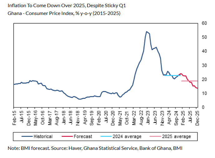 “While Ghanaian inflation will follow a more stable and cooling path over 2025, it has started 2025 relatively sticky, coming in at 23.5% year-on-year in January. This is an acceleration from the 2024 low of 20.3% year-on-year in August 2024. Despite the slight reacceleration, inflation will continue to broadly come down and is supporting improving households purchasing power, particularly when considering inflation hit a peak of 54.1% in December 2022”, it stated in a report titled “Ghana 2025 Consumer Outlook: Growth Moves Up As Stronger Tailwinds Emerge”.