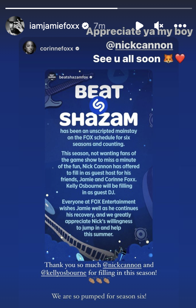 He also took to his Instagram Story and thanked Nick Cannon, after it was revealed the TV personality would fill in for Foxx as the guest host of Beat Shazam during its sixth season.